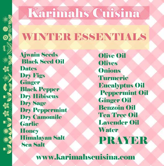 it is vital; like ital to have a store of winter eseentials, please see the list below.over the following days and weeks in shaa allah, we will go through them and suggest methods of how they can be used to possibley enhanced human health.